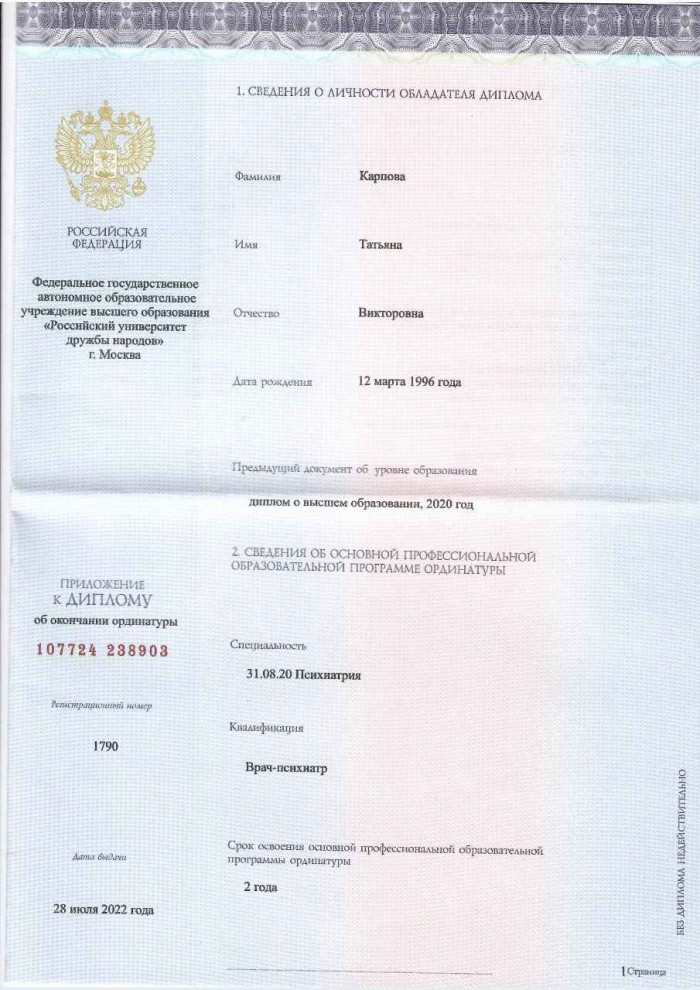 Психиатр-нарколог Татьяна Викторовна Карпова занимается диагностикой, лечением и профилактикой зависимостей, а также сопутствующих психических заболеваний. В лечении сочетает медикаментозную терапию и психотерапевтическое воздействие: кодирование, групповую и индивидуальную терапию.