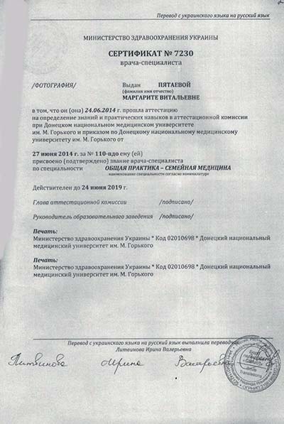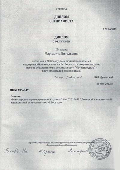 - В 2012 году Пятаева Маргарита Витальевна окончила с отличием обучение в Донецком национальном медицинском университете им. М. Горького по специальности "Лечебное дело" и получила квалификацию врача.